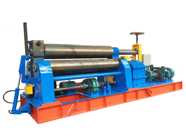該機(jī)為對(duì)稱式三輥卷板機(jī),兩下輥為主動(dòng)固定輥,上輥通過升降絲桿、渦輪、蝸桿在兩下輥對(duì)稱中央作上下移動(dòng),兩下輥的正、反旋轉(zhuǎn)和上輥的升降移動(dòng)均靠電機(jī)帶動(dòng)減速器來完成,并能借助手動(dòng)離合器把上輥調(diào)節(jié)成平行或傾斜位置,以適應(yīng)卷制圓形和錐形工件的需要,尾端設(shè)有液壓倒頭翻轉(zhuǎn)裝置,有電器控制,取代了一般三輥卷板機(jī)使用人工倒頭的方法,渦輪上下配有特種壓力軸承,轉(zhuǎn)動(dòng)輕松、省電耐磨。該機(jī)集機(jī)身、傳動(dòng)、液壓、電器部分為一整體,其結(jié)構(gòu)緊湊、操作方便、便于搬運(yùn)、安裝和維護(hù)。
