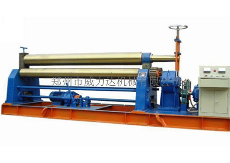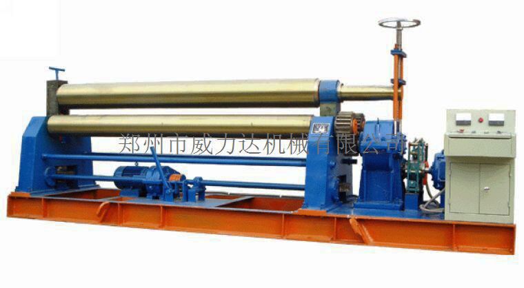 該機為對稱式三輥卷板機,兩下輥為主動固定輥,上輥通過升降絲桿、渦輪、蝸桿在兩下輥對稱中央作上下移動,兩下輥的左、右旋轉和上輥的升降移動均靠電機帶動減速器來完成,并能借助手動離合器把上輥調(diào)節(jié)成平行或傾斜位置,以適應卷制圓形和錐形工件的需要,渦輪上下配有特種壓力軸承,轉動輕松、省電耐磨。該機集機身、傳動、電器部分為一整體,其結構緊湊、操作方便、便于搬運、安裝和維護。